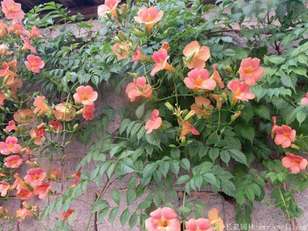 凌霄,棵型總高度0.5~2米高之間,葉子形態根據種類有區別有差別,有些較為細長,有些接近橢圓,凌霄花顏色是豐富,如紅色,粉紅色,黃綠色,粉白色等,開花的時間比較長,花量大,每年的是開花的季節時候從6月上旬到8月,種子9~10月熟透,有較好的發芽水平。大量散布在東亞,歐洲省市,我們國家的江蘇沭陽,遼寧,張家口,山東,河南等等全是凌霄的主要產區。