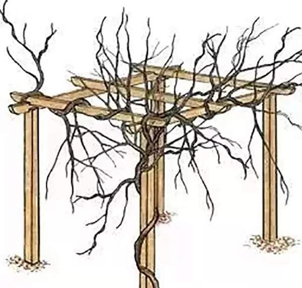 ▲紫藤骨架定型以后,應(yīng)在每年冬天剪去枯死枝、病蟲枝、纏繞過分的重疊枝。一般小側(cè)枝,留2至3個(gè)芽短截,使架面枝條分布均勻。