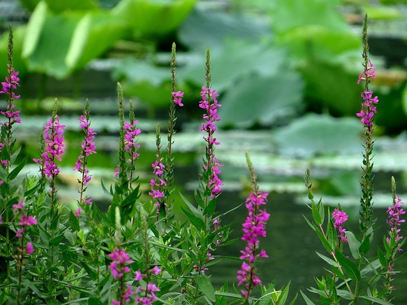 千屈菜又叫水枝柳、水柳、對葉蓮等,多年水生宿根草本植物,植株高約1米,直立生長,主桿上有許多分枝,葉子對生,披針形。葉子長4~6cm,寬1cm左右??偁罨ㄐ蹰L在較上面,長約30cm,花朵簇生。