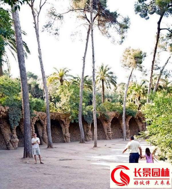 這里有堪稱(chēng)是世界第一長(zhǎng)度的座椅。長(zhǎng)椅用石砌成,形似波浪蜿蜒曲折。表面用馬賽克碎片隨意拼貼,圖形各異且隱含寓意。長(zhǎng)椅根據(jù)人體力學(xué)設(shè)計(jì),靠