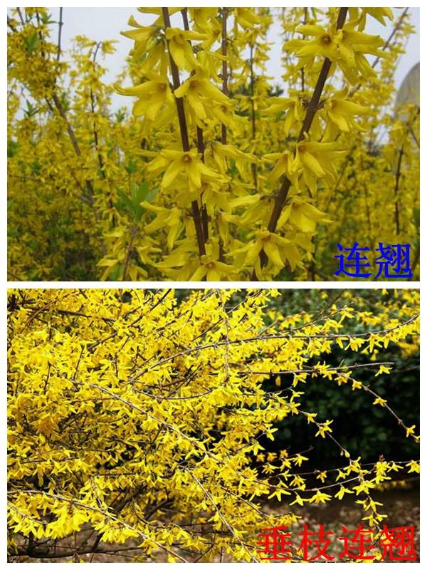 垂枝連翹:垂枝連翹是連翹的變種,跟連翹非常的相似,,一般的連翹枝條生長的都比較直立,只不過枝條比較柔軟纖細呈下垂狀態,它的花期在3-5月,果期在7-9月。