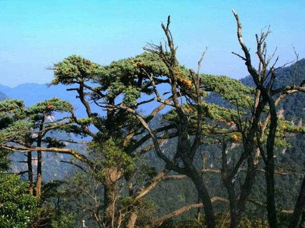 華南五針?biāo)蓪偎煽扑蓪傥遽標(biāo)山M,是松科中最原始、最古老的一族,為我國特有樹種,1999年被確定為國家Ⅱ級重點保護(hù)野生植物,主要分布在廣東、廣西、湖南、貴州海拔700米—1600米的亞熱帶山地。到了冬天,為了適應(yīng)懸崖峭壁的嚴(yán)酷環(huán)境,華南五針?biāo)蓵置诔鲆环N白色防寒物質(zhì),成為與眾不同的“藍(lán)松”,有時甚至呈現(xiàn)出光彩奪目的粉藍(lán)色。